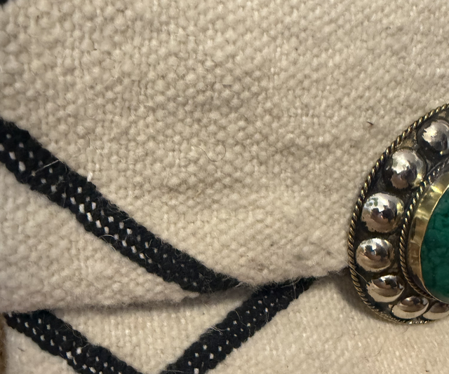 Bolso tipo cartera de telar bereber hecho a mano con diseño geométrico. Incluye un detalle central decorativo y enganches para añadir asa desmontable. Un accesorio único, artesanal y perfecto para looks casual o de noche.