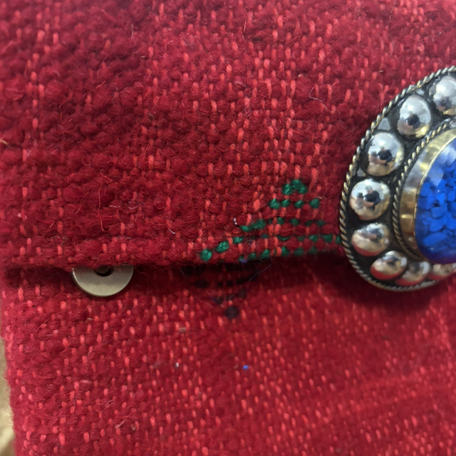Bolso tipo cartera de telar bereber hecho a mano con diseño geométrico. Incluye un detalle central decorativo y enganches para añadir asa desmontable. Un accesorio único, artesanal y perfecto para looks casual o de noche.