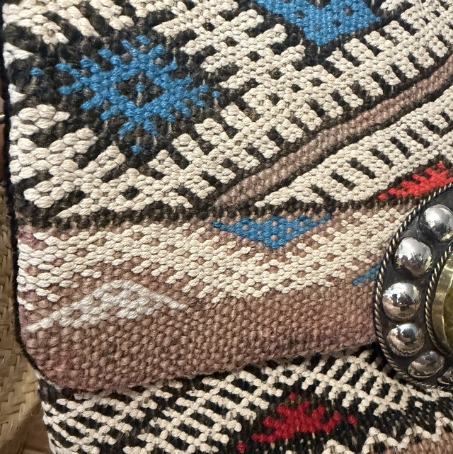 Bolso tipo cartera de telar bereber hecho a mano con diseño geométrico. Incluye un detalle central decorativo y enganches para añadir asa desmontable. Un accesorio único, artesanal y perfecto para looks casual o de noche.