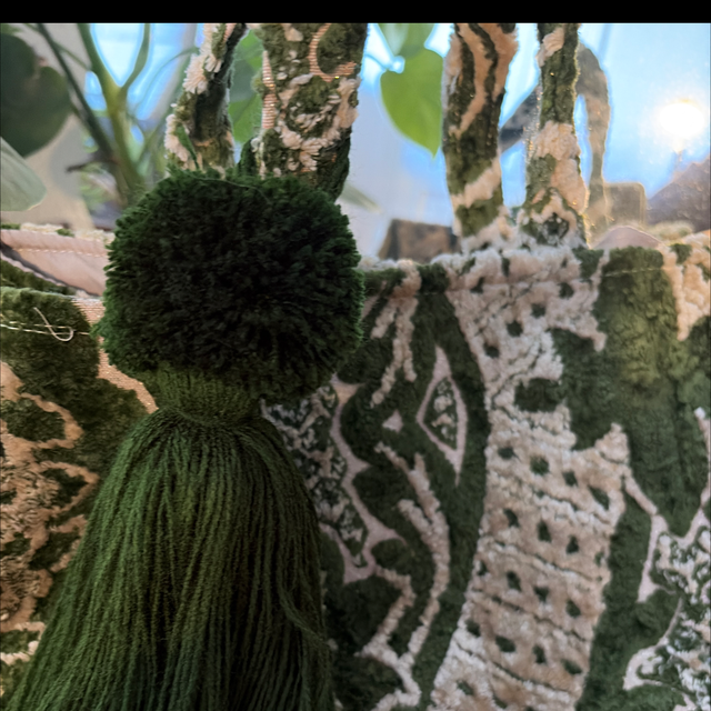 Bolso confeccionado con alfombra marroquí hecha a mano, con textura suave y un diseño en tonos cálidos. Incluye aperturas laterales para mayor comodidad y un pompón intercambiable para que puedas personalizarlo a tu gusto.