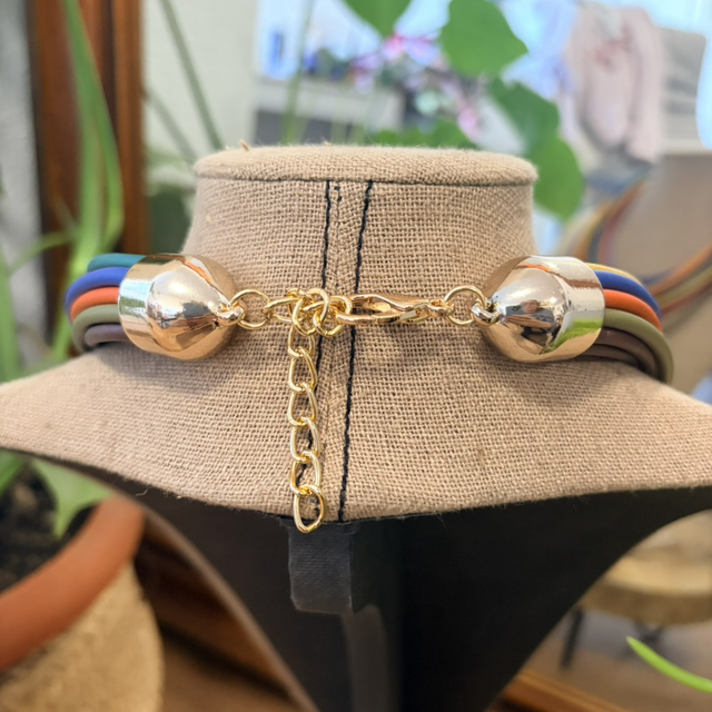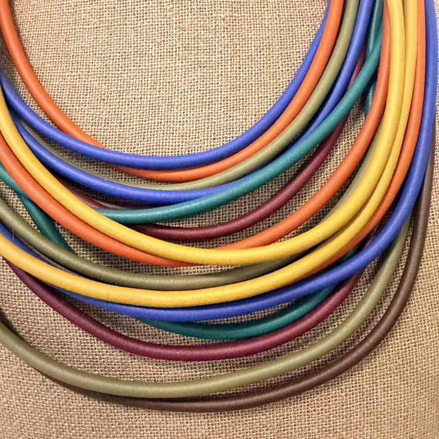 El Collar Arco Iris es una pieza llena de vida, creada a partir de caucho reciclado para quienes buscan color, ligereza y un diseño comprometido con el cuidado del entorno. Sus múltiples cordones en tonos vibrantes se superponen con armonía, aportando un toque alegre y versátil a cualquier look.