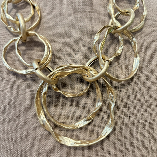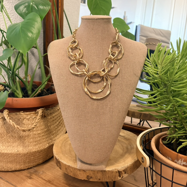 El Collar Círculos de Luz es una pieza elegante y poderosa, formada por aros dorados de textura orgánica que se enlazan entre sí como un pequeño universo en movimiento. Su diseño juega con las formas imperfectas, creando un brillo suave y cálido que ilumina cualquier look.