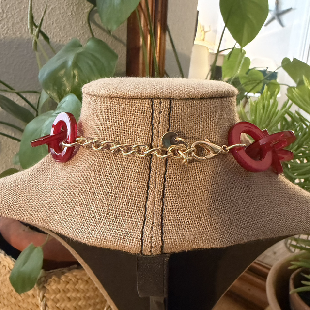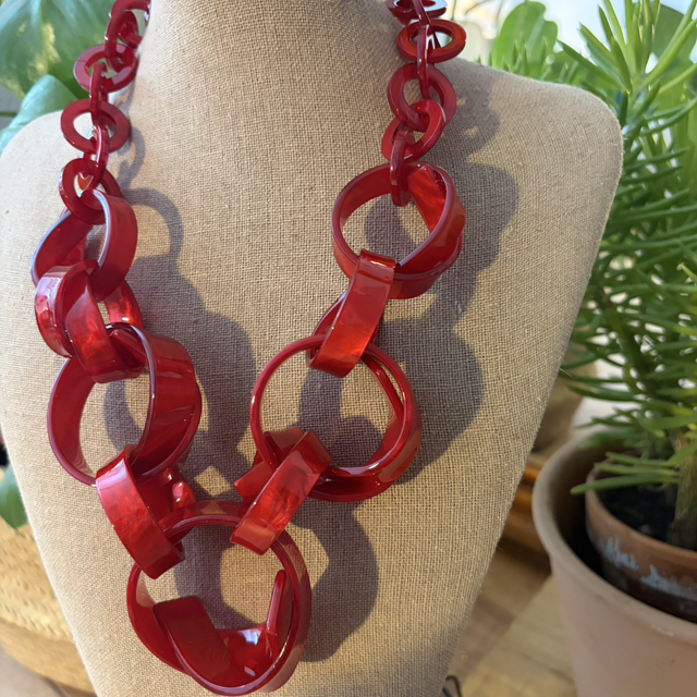 Este llamativo collar está elaborado con grandes eslabones de resina en un vibrante tono rojo que aporta fuerza, modernidad y un estilo único. Sus formas circulares y volúmenes audaces crean una pieza ligera pero de presencia impactante, perfecta para quienes buscan un accesorio que destaque por sí mismo.