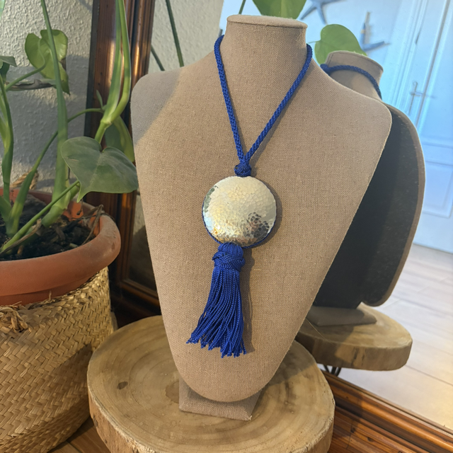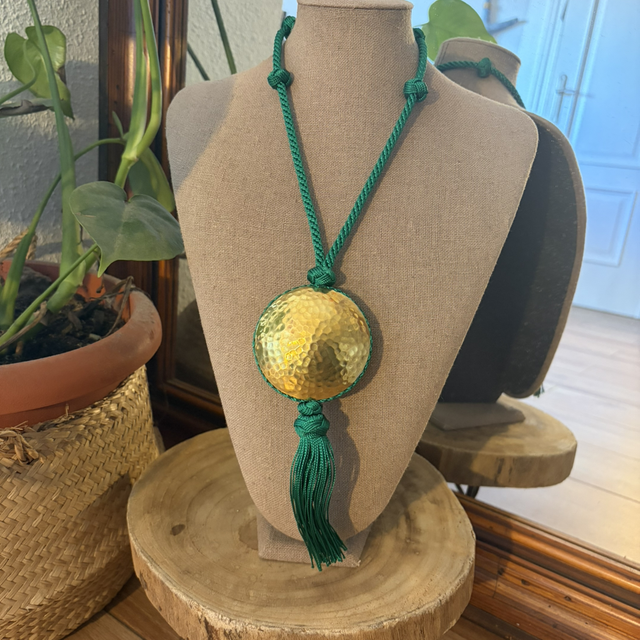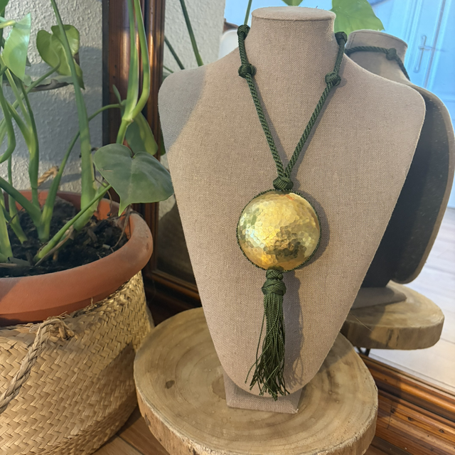 Collar de cordón de seda con nudos decorativos y medallón de bronce martillado. Su diseño ajustable permite adaptarlo a diferentes largos. Ligero, elegante y con un toque artesanal que aporta brillo y personalidad a cualquier look.