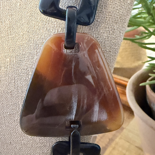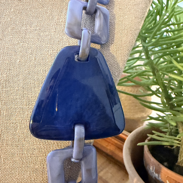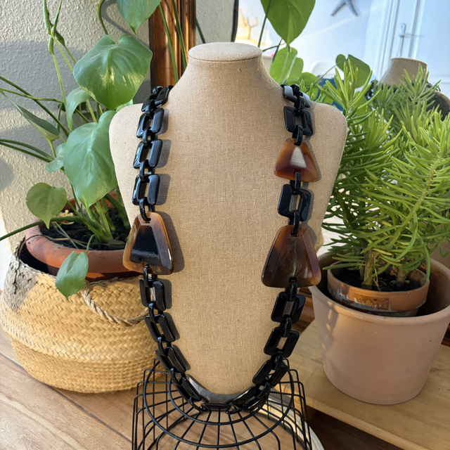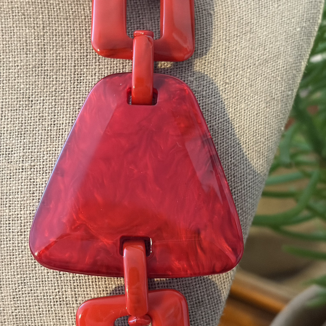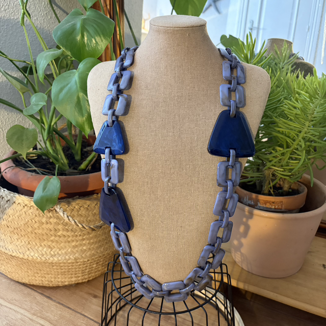 Collar elaborado en piezas de resina con formas geométricas que combinan eslabones rectangulares y triángulos estilizados. Su diseño ligero pero contundente aporta personalidad y color a cualquier conjunto, convirtiéndose en un accesorio que destaca sin esfuerzo.