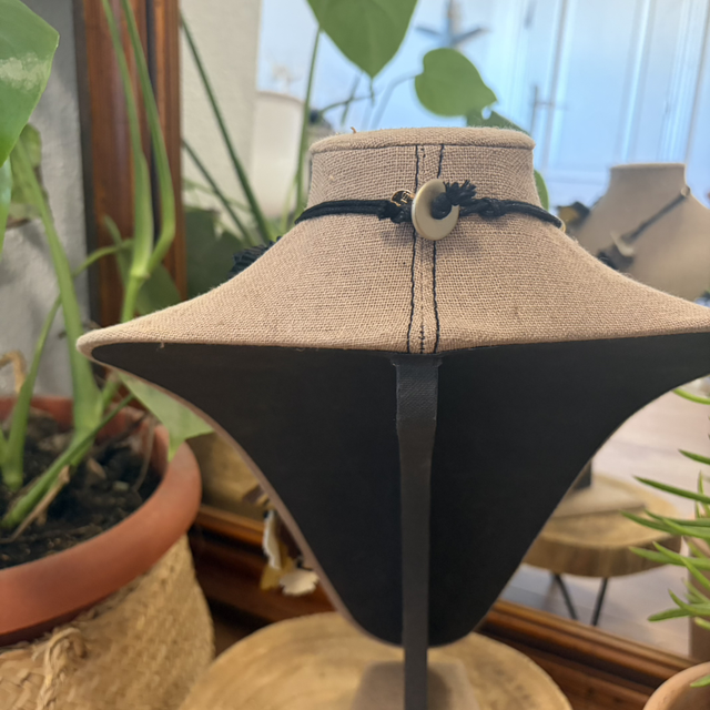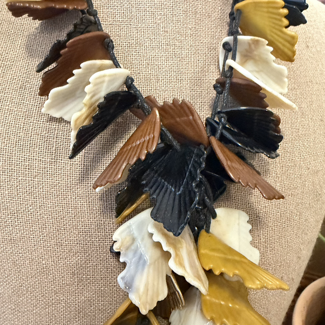 Collar artesanal formado por delicadas hojas de resina en tonos tierra, negro, marfil y mostaza. Su diseño en cascada crea un efecto dinámico y elegante, ideal para quienes buscan una pieza llamativa y sofisticada.