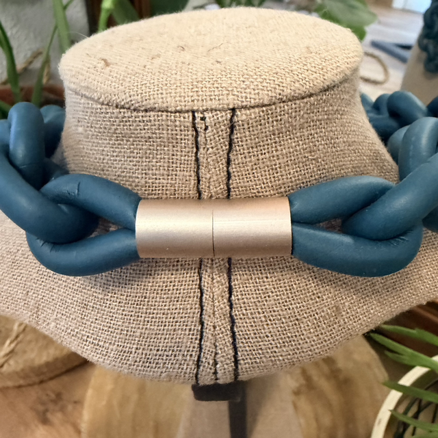 Hecho con caucho reciclado, sus eslabones gruesos crean volumen y presencia, pero sorprende lo ligero que es: no pesa nada.