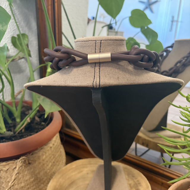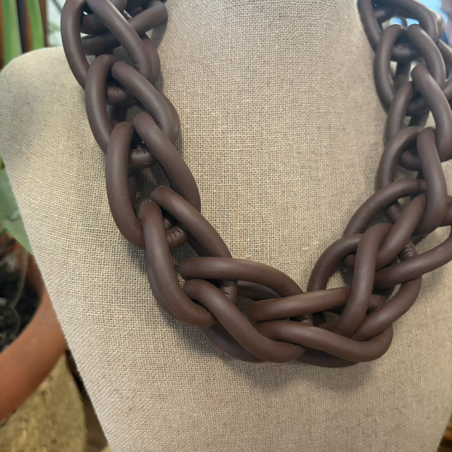 Collar ligero de caucho entrelazado con cierre imán para poner y quitar fácilmente. Su color marrón chocolate lo hace combinable y su diseño moderno lo convierte en un accesorio imprescindible.