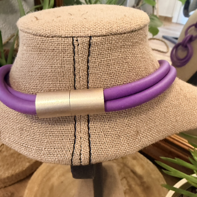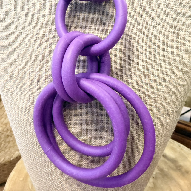 Este collar de diseño contemporáneo destaca por su estilo moderno y elegante. Elaborado en caucho de alta calidad, presenta una composición de aros entrelazados en un intenso color violeta que aporta personalidad y sofisticación a cualquier look.