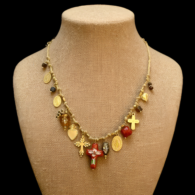 Gargantilla de cordón de seda con charms bañados en oro de 18 kilates y una cruz esmaltada.