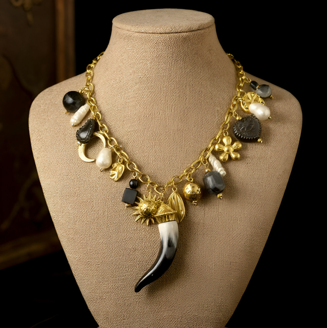 Gargantilla de acero con charms en acero bañado en oro de 18 kilates y resina, con una longitud de 45 cm y cadena de extensión.
