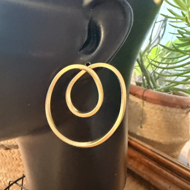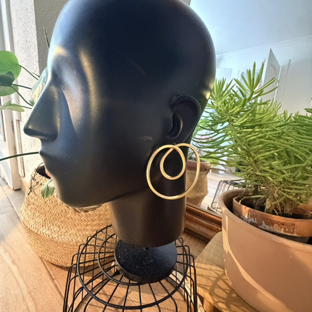 Este pendiente de doble aro es una pieza de líneas limpias y presencia serena. Su diseño juega con el equilibrio entre sencillez y carácter, creando un movimiento visual elegante sin resultar excesivo.