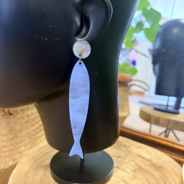 Un pendiente largo y ligero elaborado en resina nacarada, con un acabado suave y veteado que aporta un brillo delicado. La pieza principal tiene forma de pez estilizado, alargado y elegante, en tonos blanco–azulados con leves matices beige. Va unido a una base redonda de resina marmoleada en tonos crema, creando un contraste armonioso y muy Mediterráneo.