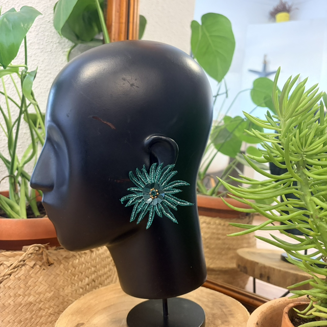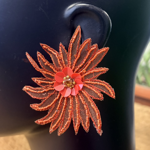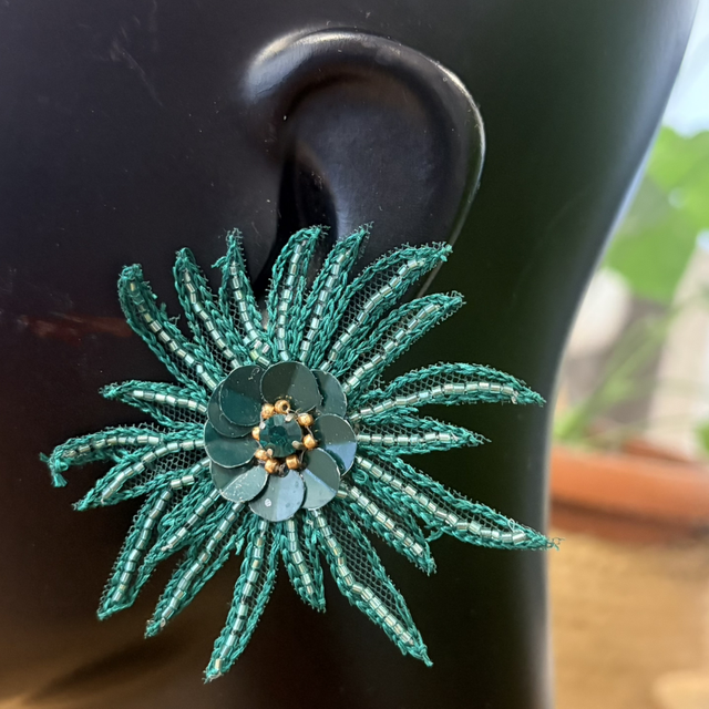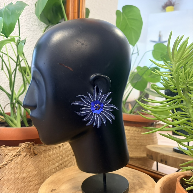 Pendientes en forma de flor trabajados con alambre moldeado y detalles de lentejuelas que aportan brillo y textura. Su diseño amplio, ligero y lleno de movimiento crea un efecto vistoso sin perder delicadeza.
