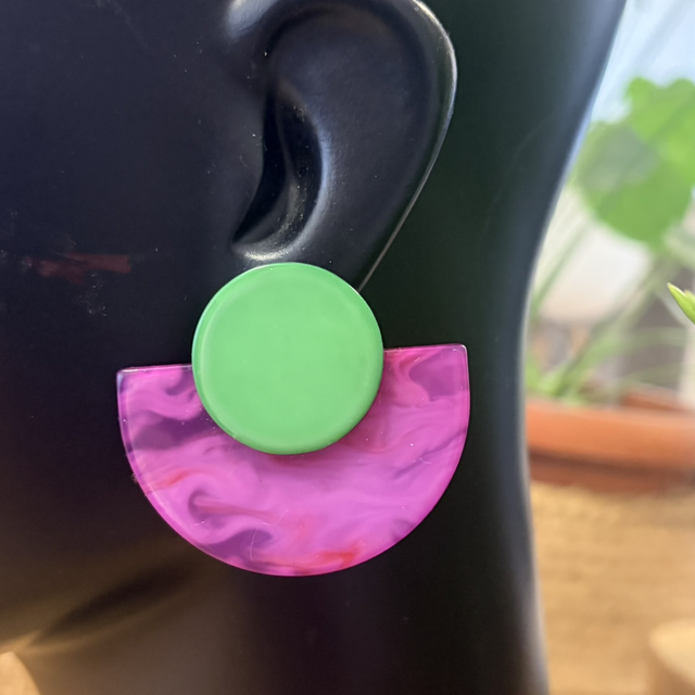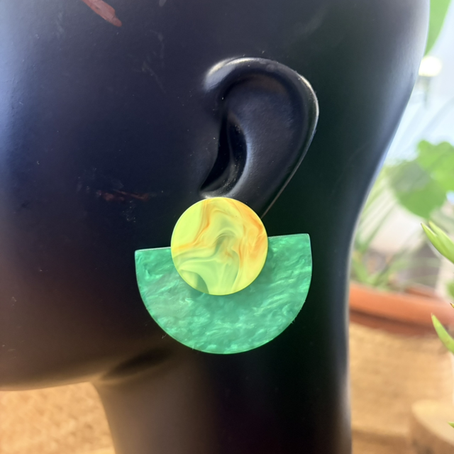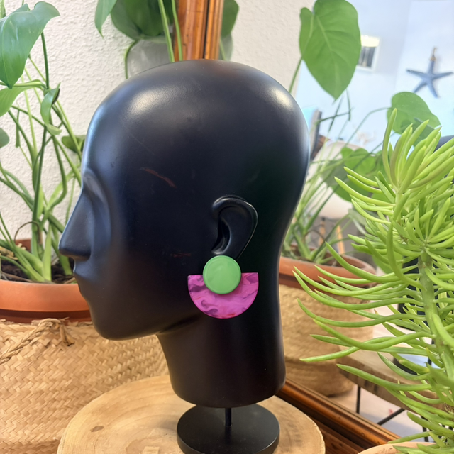 Pendientes de resina ligera con un diseño geométrico que combina formas redondeadas y líneas limpias. Una pieza con personalidad, actual y muy favorecedora, pensada para quienes disfrutan de accesorios distintos y con carácter propio.