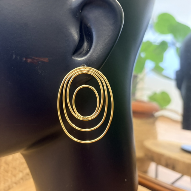 Pendientes ligeros y luminosos creados en acero bañado en 24K, con un diseño de óvalos concéntricos que se mueven suavemente y atrapan la luz en cada gesto.