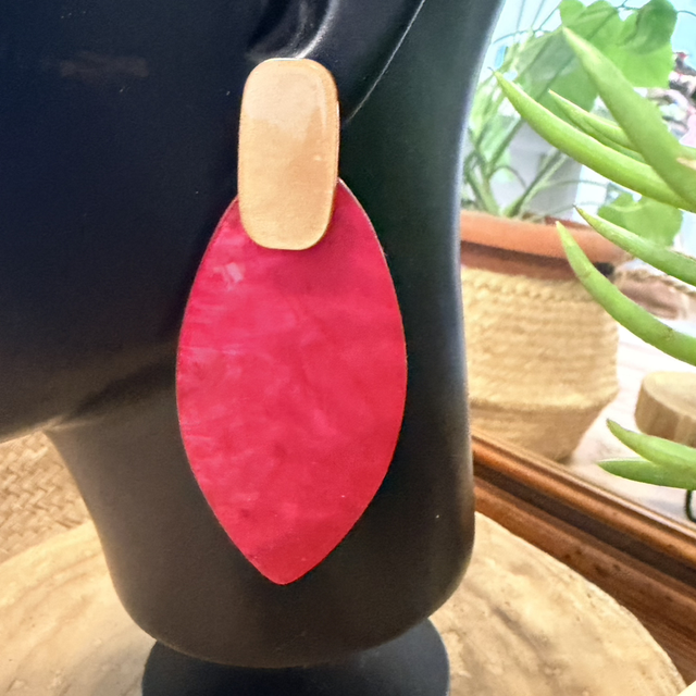 El rojo, vibrante y luminoso, aporta energía y personalidad, mientras que la forma alargada estiliza y enmarca el rostro con elegancia.