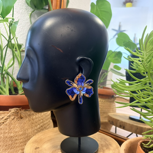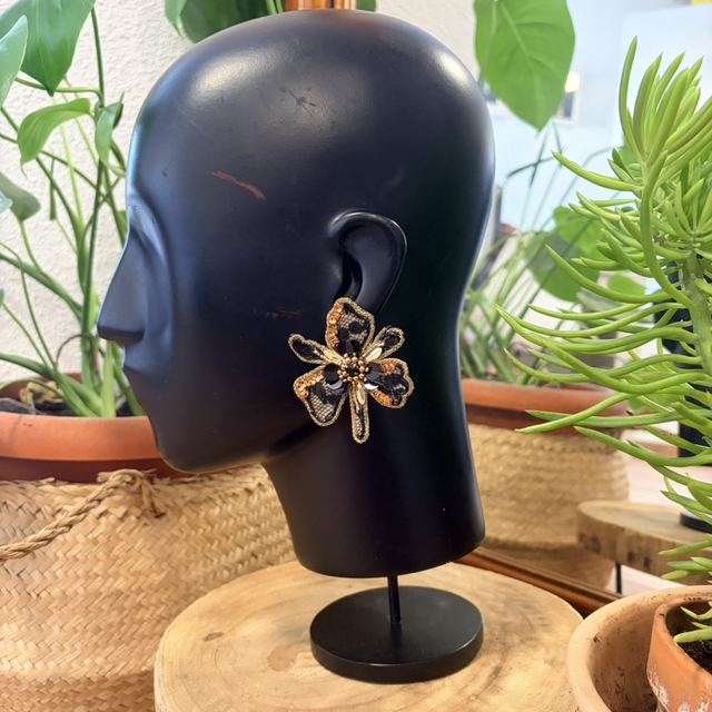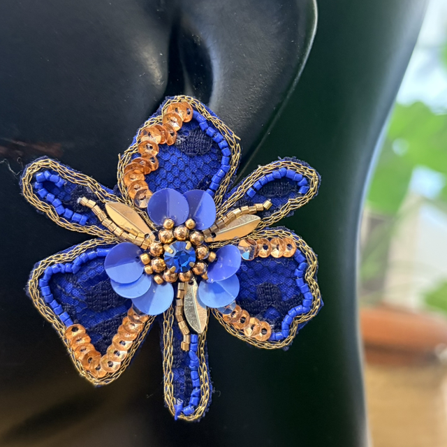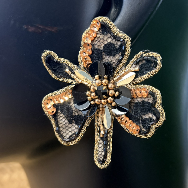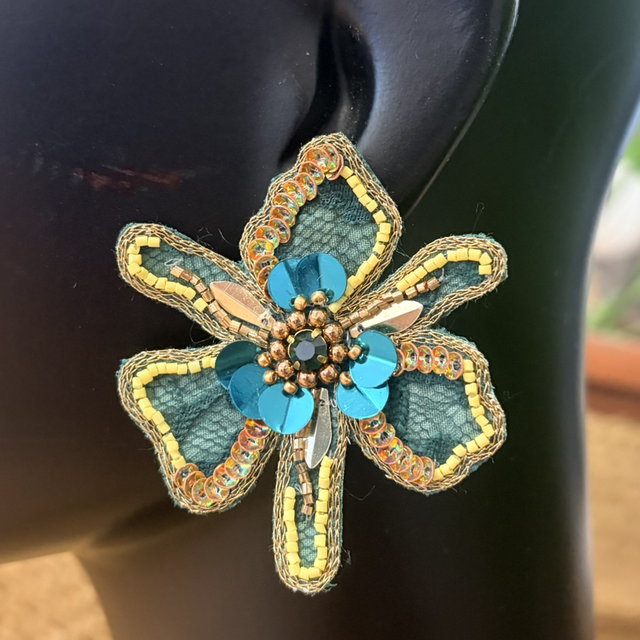 Los Pendientes Encaje Bordado combinan alambre trabajado a mano, detalles de lentejuelas y una delicada base de tul, creando una pieza ligera, expresiva y llena de textura. Su diseño abierto y artesanal juega con la transparencia y el brillo, dando como resultado un accesorio que capta la luz y realza el rostro con sutileza.