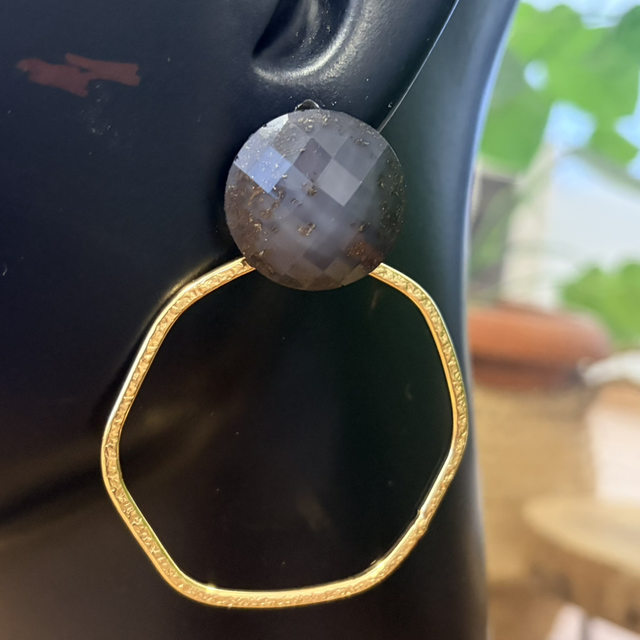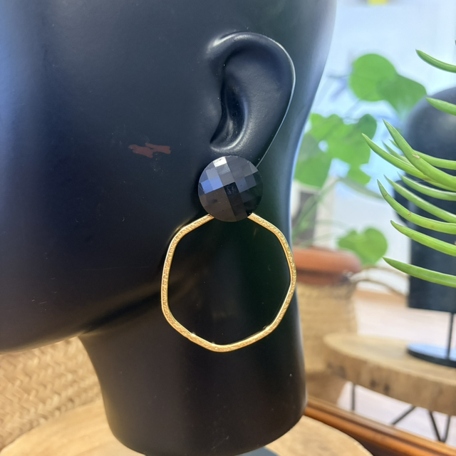 Pendientes con personalidad propia, creados con cristal tallado en tonos gris ahumado y negro, combinados con un aro irregular en acero bañado en 24K.